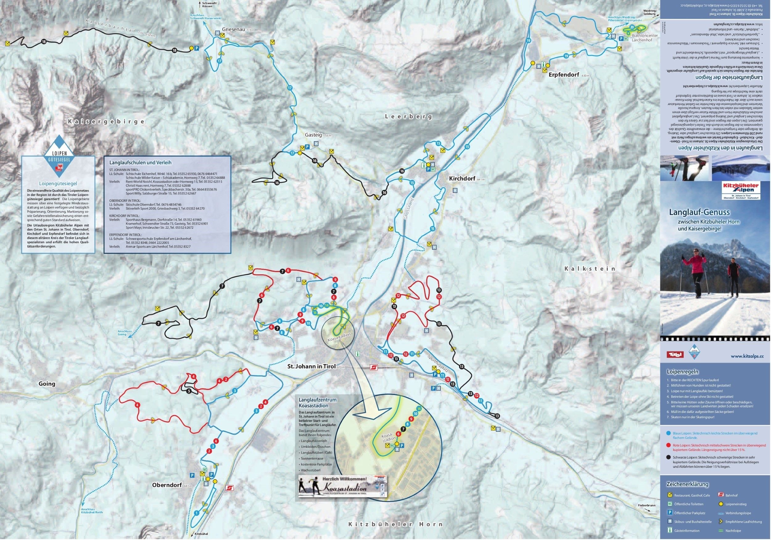Beliebter und praktischer Anlaufpunkt für Nordic-Sportler ist das Koasastadion, da es hier eine Langlaufschule und -verleih, Umkleiden und Duschen gibt. Vom Stadion aus startet die Hinterkaiserloipe, die direkt am Fuße des Kaisergebirges entlang führt. Mit ihren 13,5 km Länge sowie Anstiegen und Abfahrten ist sie den gut konditionierten Langläufern vorbehalten. Für verlängertes Langlaufvergnügen gibt es in St. Johann zudem eine 3 km lange, leicht zu laufende Nachtloipe.